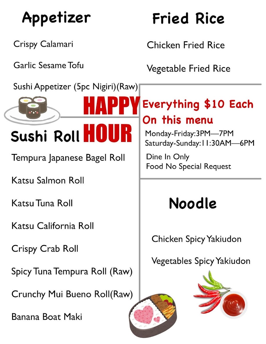 “ Wide variety of Asian choices that includes vegan ,vegetarian , teriyaki and sushi. If you want it , it was there. You have many delicious inexpensive appetizers to choose from and we wanted them all we did try almost all of them. We did not regret any of the choices. They were all excellent. I did my favorite was the bacon wrapped asparagus, while my coworker really like bacon wrapped scallops, and beef negamaki. The sushi was so fresh and the shrimp teriyaki incredible. ”